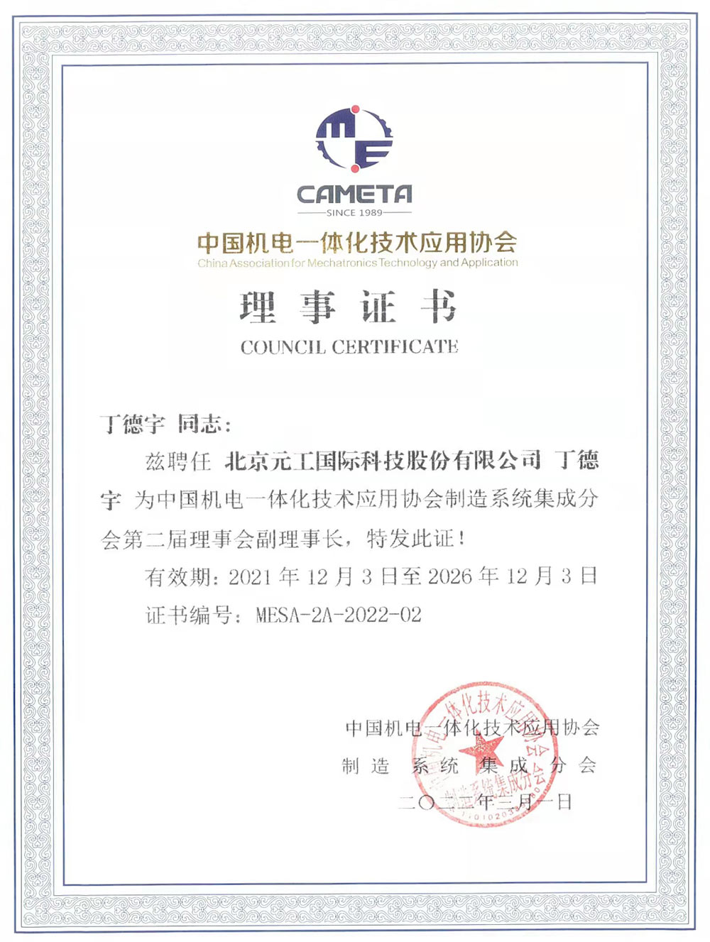 2022年3月1日,北京元工国际科技股份有限公司创始人丁德宇先生被聘任为中国机电一体化技术应用协会制造系统集成分会第二届理事会副理事长。