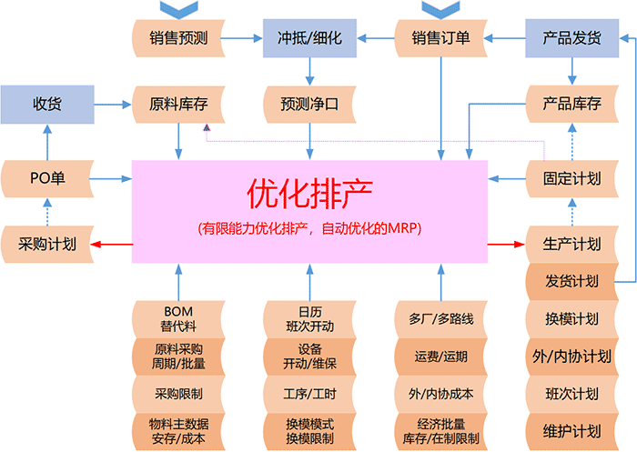 订单冲抵预测确定预测净口并进行细化(通常按比例分配到常售型号),预测净口/订单与产品净库存匹配确定缺口,考虑有限能力和物料约束进行排产。