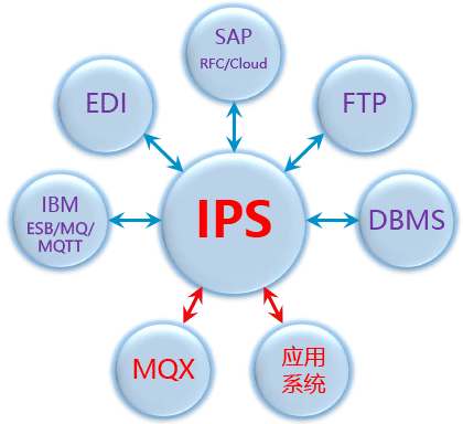 - IPS(Interface Processing System)用于与MQX、DBMS、ESB/MQ/MQTT、SAP(RFC/Cloud)、WebService、RESTful、EDI和FTP等接口,通过配置处理数据收发、转换等问题。