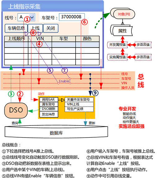 - 界面总线(Bus)是OBA的灵魂,是各个对象相互联通相互协同的基础。通过界面总线,界面控制自动化,省去了界面控制代码。①~⑨示例了界面总线功能。